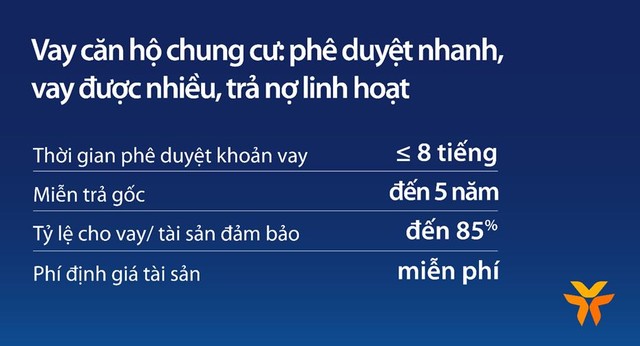 Nhờ ứng dụng công nghệ và đơn giản hóa thủ tục cho vay, VIB cũng triển khai duyệt vay nhanh trong 8 tiếng, miễn phí định giá tài sản với căn hộ thuộc danh sách chung cư tại Hà Nội và TP HCM. Những yếu tố ưu đãi trên đang giúp ước mơ, mong muốn của những người muốn mua căn nhà đầu tiên thành hiện thực.