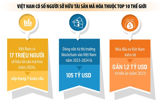 Riêng với tiền mã hóa, Việt Nam là nơi có cộng đồng đầu tư mạnh mẽ nhất, với 17 triệu nhà đầu tư sở hữu tài sản mã hóa (năm 2024), đứng thứ 7 toàn cầu.