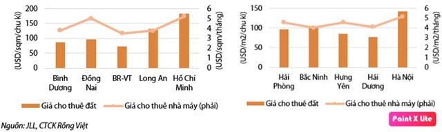Giá cho thuê đất và nhà xưởng trung bình tại các tỉnh phía Bắc và phía Nam