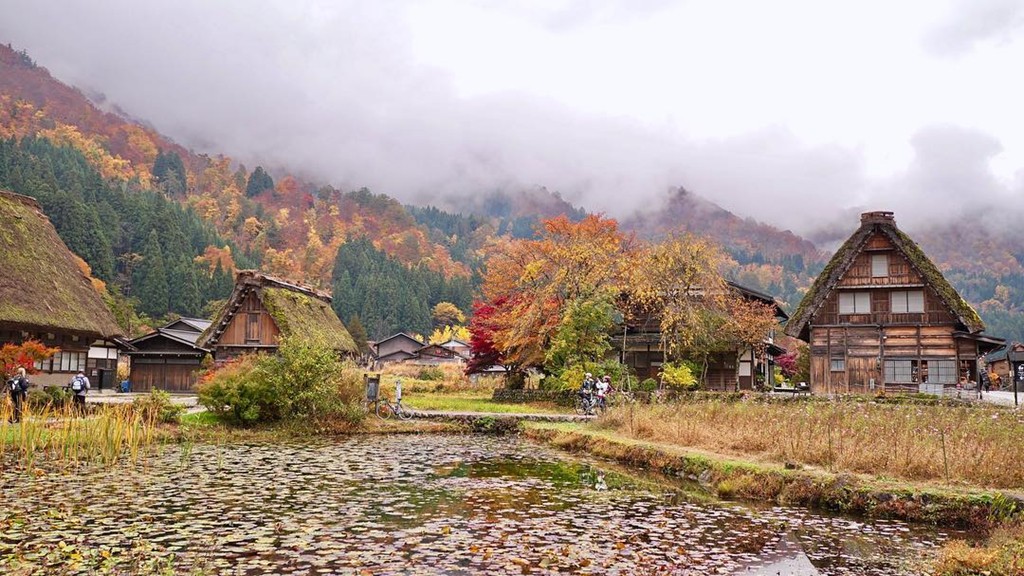 Làng cổ Shirakawago (Gifu, Nhật Bản) nổi tiếng bởi khung cảnh cổ tích tuyết phủ trắng xóa vào mùa đông. Không chỉ hút khách vào mùa tuyết rơi, mùa thu lá vàng tại Shirakawago cũng khiến dân xê dịch xao xuyến với cảnh đẹp mơ màng. Nét độc đáo của làng cổ là những ngôi nhà cổ trăm tuổi yên bình bên rừng cây thay màu lá.