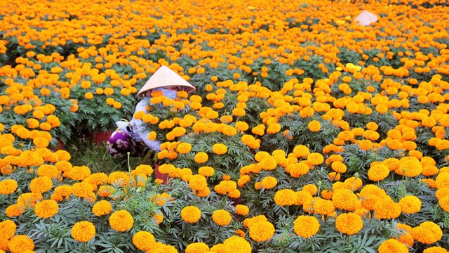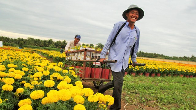 Nay, nhiều nhà vườn trồng hoa cúc vạn thọ được giá nên rất phấn khởi, Ảnh: Mậu Trường