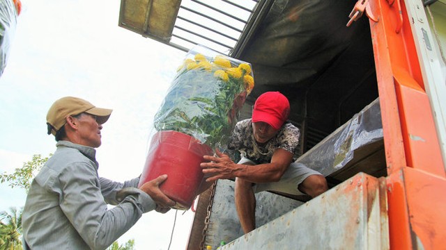 Từ sáng 20-1, hàng trăm xe tải từ các tỉnh Bình Dương, Đồng Nai và nhiều nhất là từ TP.HCM đậu nối hàng dài trên các tuyến đường huyện Chợ Lách, Mỏ Cày Bắc để chở hoa.
