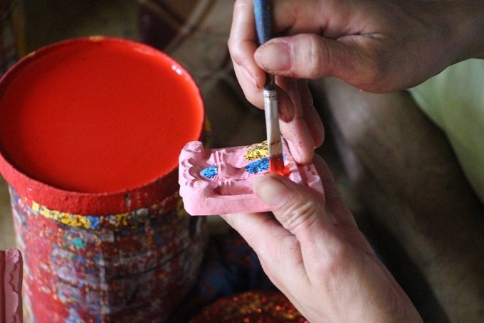 Trước khi đưa ra thị trường, tượng ông Công ông Táo được vẽ màu rồi rắc bột kim tuyến lên để tạo sự bắt mắt. Thông thường, công đoạn này đến gần ngày 23 tháng chạp mới làm.