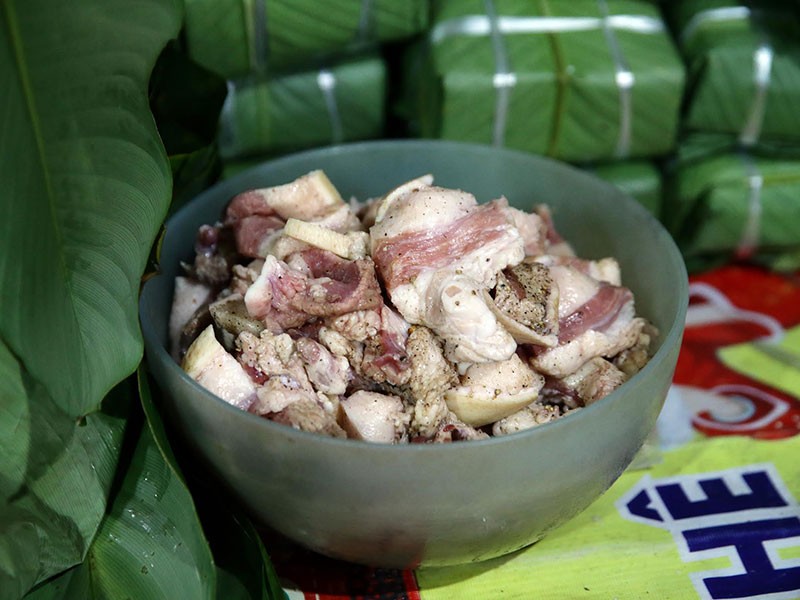 Những miếng thịt lợn được thái to bản cho những chiếc bánh chưng vuông theo đơn đặt hàng của khách