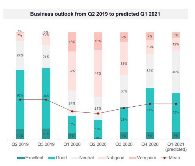 Khi được hỏi về triển vọng kinh tế Việt Nam trong quý tới, 57% thành viên EuroCham tham gia khảo sát dự đoán sự “ổn định và cải thiện” sẽ được duy trì trong 3 tháng đầu năm 2021. So với 39% trong quý III/2020, sự tự tin về triển vọng kinh tế tăng tới 18%.