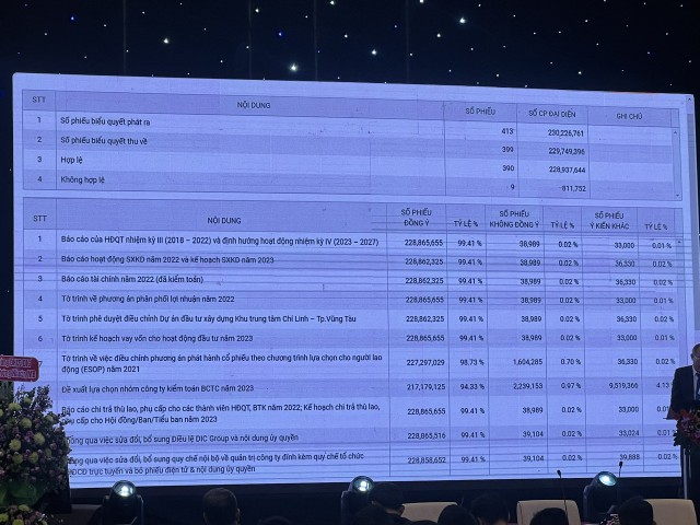 Sau ĐHCĐ thường niên năm 2023 lần 1 bất thành do không đủ tỷ lệ tham dự theo quy định. ĐHCĐ thường niên lần 2 của DIG đã diễn ra thành công với tỷ lệ cổ đông tham dự đại diện 37,58% số cổ phiếu có quyền biểu quyết.