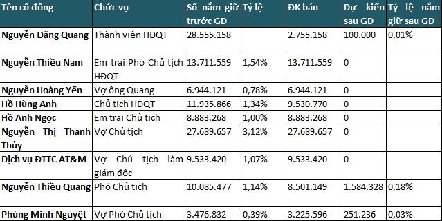 Cụ thể: Ông Hồ Hùng Anh - Chủ tịch hội đồng quản trị đăng ký bán ra hơn 9,5 triệu cổ phiếu; hai thành viên hội đồng quản trị là ông Nguyễn Đăng Quang và ông Nguyễn Thiều Quang bán ra lần lượt hơn 2,7 triệu cổ phiếu và hơn 8,5 triệu cổ phiếu. Người nhà của các thành viên này cũng đăng ký bán ra cổ phiếu cùng đợt.