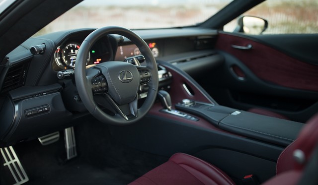 Nội thất LC500 hòa trộn chất liệu da và nhôm. Xe trang bị màn hình 8 inch, ghế lái có sưởi, chỉnh điện 10 hướng, nhớ vị trí. Đèn trang trí nội thất, điều hòa tự động hai vùng.