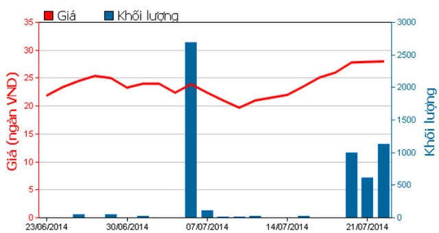 Biểu đồ giao dịch, khối lượng của LGC trong 1 tháng qua. Nguồn HOSE