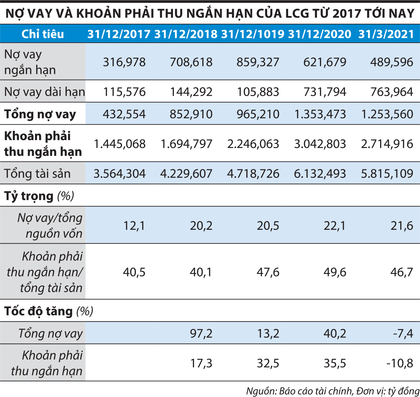 Kể từ năm 2017 tới nay, Licogi 16 liên tục gia tăng nợ vay: nếu như năm 2017, tổng nợ vay ngắn hạn và dài hạn là 432,6 tỷ đồng, chiếm 12,1% tổng nguồn vốn, thì tới 31/3/2021 là 1.253,6 tỷ đồng, chiếm 21,6% tổng nguồn vốn, trong đó có 489,6 tỷ đồng nợ vay ngắn hạn.