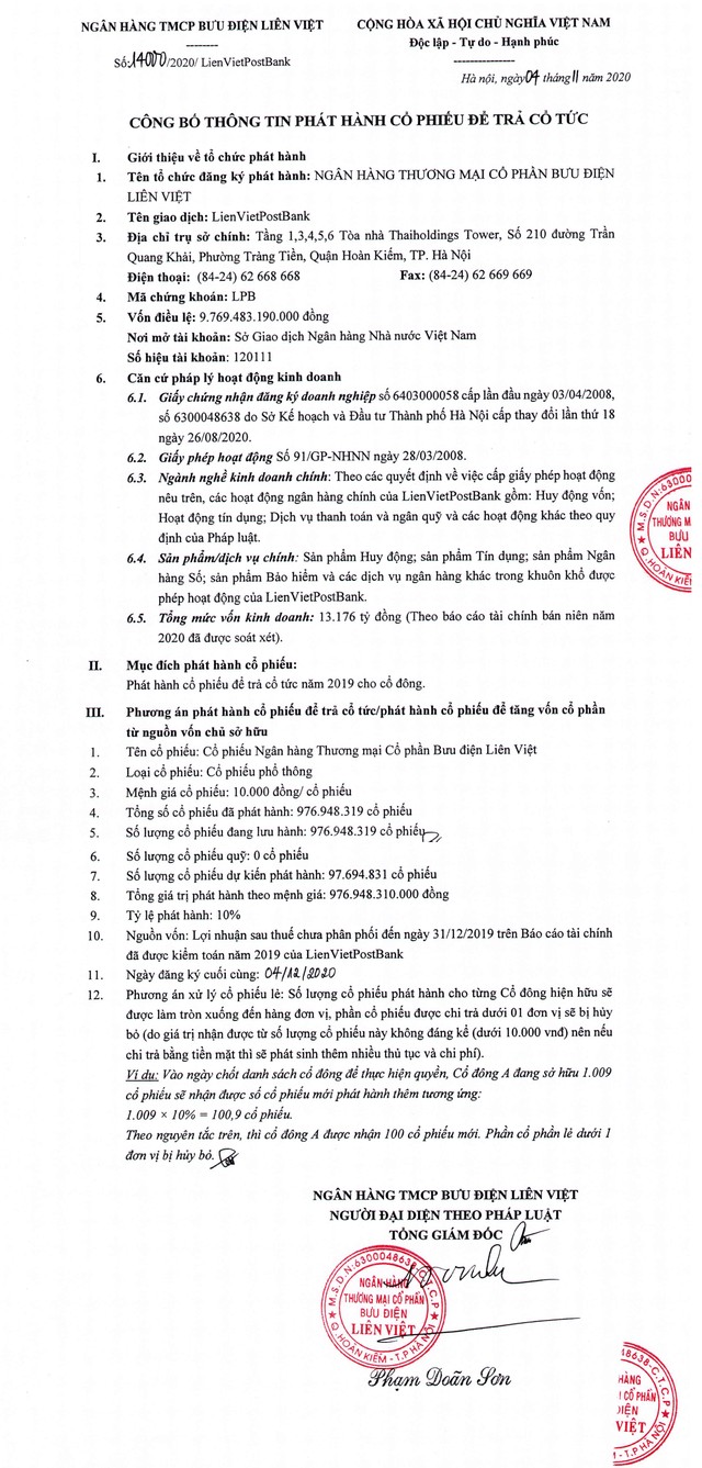 Lienvietpostbank thông báo phát hành cổ phiếu để trả cổ tức