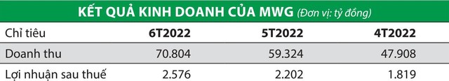 Trong 6 tháng đầu năm 2022, Công ty cổ phần Đầu tư Thế giới Di động (mã chứng khoán MWG) đạt tổng doanh thu 70.804 tỷ đồng, tăng 13% so với cùng kỳ năm 2021 và hoàn thành 51% kế hoạch năm; lợi nhuận sau thuế 2.576 tỷ đồng, tăng 1% so với cùng kỳ năm 2021 và hoàn thành 41% kế hoạch năm.
