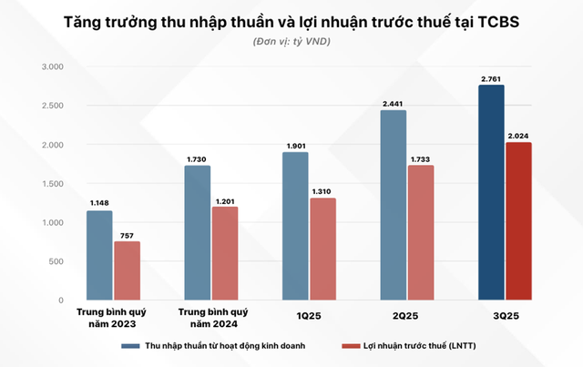 Lợi nhuận trước thuế quý III/2025 của TCBS tiếp tục tăng trưởng bứt phá kỷ lục, đạt 2.024 tỷ đồng, tăng trưởng 85% so với cùng kỳ năm ngoái. Lũy kế 9 tháng đầu năm 2025, lợi nhuận trước thuế của Công ty đạt 5.067 tỷ đồng, tăng 31% so với cùng kỳ 2024 và đạt gần 90% kế hoạch cả năm 2025.