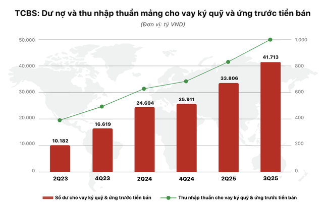 Mảng cho vay ký quỹ và ứng trước tiền bán: Quý III/2025, thu nhập từ lãi các khoản cho vay ký quỹ và ứng trước tiền bán của TCBS đạt 998 tỷ đồng, tiếp tục bứt phá vượt 20% so với kỷ lục đã lập trong quý II/2025 và tăng 44% so với cùng kỳ năm trước. Tính đến ngày 30/09/2025, dư nợ cho vay ký quỹ của TCBS đạt mức 41.713 tỷ đồng, tăng 23% so quý trước và tăng 64% so với cuối năm ngoái. Kết quả ấn tượng này đến từ chính sách giá, phí cạnh tranh của TCBS và các chương trình ưu đãi cho khách hàng lần đầu sử dụng dịch vụ, mang lại tăng trưởng khách hàng mới vượt gần 30% so với quý 2/2025.