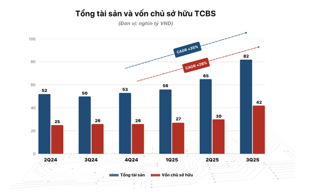 Đáng chú ý, trong tháng 9, TCBS đã thực hiện thành công đợt chào bán lần đầu ra công chúng IPO với hơn 231 triệu cổ phiếu thu hút hơn 10.800 tỷ đồng vốn góp từ các nhà đầu tư trong và ngoài nước, đưa tổng vốn điều lệ và vốn chủ sở hữu tại ngày 30/9/2025 đạt 23.113 tỷ đồng và 42.478 tỷ đồng, tiếp tục khẳng định vị trí công ty chứng khoán có vốn sở hữu lớn nhất tại thị trường Việt Nam.