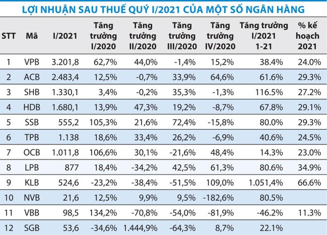 Thống kê Công ty Chứng khoán VNDirect thực hiện với các ngân hàng đã công bố báo cáo tài chính quý I/2021, mức tăng trưởng lợi nhuận của cả ngành đạt 69% so với cùng kỳ, cao hơn nhiều so với con số tăng trưởng 22% của quý I/2020.