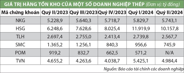 Với Thép Nam Kim và Thép Tiến Lên, giá trị hàng tồn kho trong nửa đầu năm 2024 tăng nhẹ. Giá thép giảm trong quý II nên hai đơn vị này đã thực hiện giảm hàng tồn kho, trong khi tồn kho trong quý I tăng không nhiều, nên tính đến cuối quý II/2024, giá trị hàng tồn kho biến động không đáng kể.