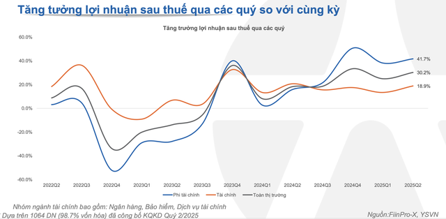 Trong đó, nhóm phi tài chính tiếp tục dẫn đầu đà tăng trưởng 4 quý liên tiếp với mức tăng trưởng 41,7% trong quý II/2025. Đặc biệt, dù chịu tác động trực tiếp từ thuế quan, nhưng nhóm xuất khẩu và bất động sản khu công nghiệp vẫn duy trì đà tăng trưởng lợi nhuận sau thuế lần lượt là 153,6% và 63%.