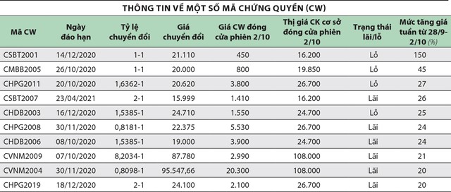Tính tổng số 81 mã CW giao dịch từ đầu tháng 9/2020 đến ngày 2/10 (không tính các mã niêm yết mới hoặc đã đáo hạn), có 44 mã CW tăng giá - chiếm tỷ lệ trên 50%. Trong đó có 41 mã tăng trên 10%, bao gồm 27 mã tăng trên 50% và 3 mã tăng trên 100%.