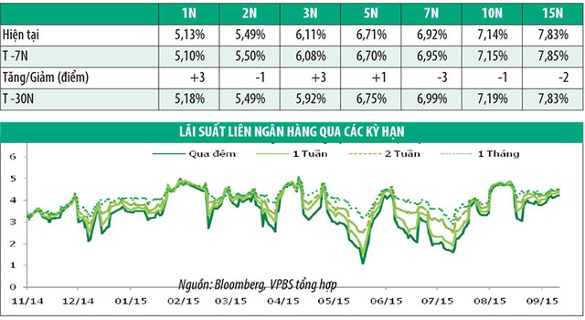 Nhu cầu vốn ngắn hạn được hỗ trợ từ nguồn tín phiếu và trái phiếu đáo hạn, dẫn tới việc thanh khoản bị dư thừa, lãi suất liên ngân hàng do vậy giảm. Nhưng vào ngày đầu tiên của tháng 10, lãi suất bắt đầu tăng nhẹ trở lại, đặc biệt tại lãi suất cho vay qua đêm vì các ngân hàng có nhu cầu vay vốn để đảm bảo nguồn dự trữ bắt buộc đầu tháng.