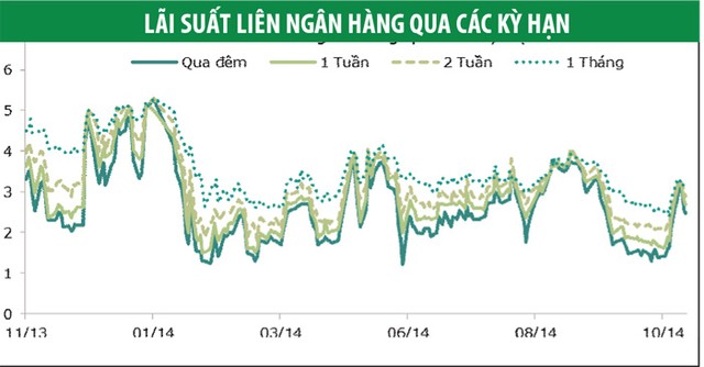Trong tuần 20 - 24/10, lãi suất kỳ hạn ngắn trên thị trường liên ngân hàng khá ổn định, trong khi lãi suất kỳ hạn dài hơn (2 tuần và 1 tháng) tăng nhẹ khoảng 20 điểm cơ bản. Theo Bloomberg, lãi suất các kỳ hạn được niêm yết ở mức: qua đêm (2,5%, không đổi), 1 tuần (2,7%/năm, không đổi), 2 tuần (3,1%/năm, +20 điểm cơ bản), 1 tháng (3,3%/năm, +20 điểm cơ bản).