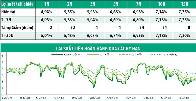 Lãi suất liên ngân hàng tuần qua tăng nhẹ tại các kỳ hạn ngắn và không đổi tại các kỳ hạn dài hơn. Lãi suất liên ngân hàng tăng nhẹ để đáp ứng nguồn vốn ngắn hạn của các ngân hàng tham gia vào thị trường trái phiếu. Bên cạnh đó, việc NHNN tiếp tục hút ròng 1 khối lượng khá lớn tuần thứ 3 liên tiếp cũng làm giảm nguồn vốn trong hệ thống và đẩy lãi suất liên ngân hàng tăng nhẹ. Kết thúc tuần, lãi suất các kỳ hạn tham khảo ở mức qua đêm (2,3%/năm, +20 điểm), 1 tuần (2,4%/năm, +20 điểm), 2 tuần (2,6%/năm, +0 điểm), 1 tháng (3,2%/năm, +0 điểm).