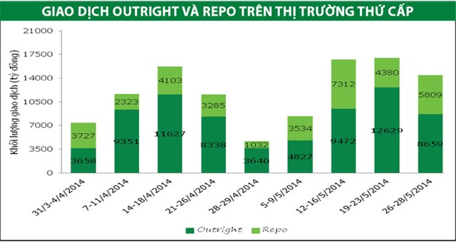 Trên thị trường thứ cấp, giao dịch sôi động và đạt 8.659 tỷ đồng đối với giao dịch outright và 2.178 tỷ đồng đối với giao dịch repo, tính đến hết ngày 28/5. Tổng giá trị giao dịch trong ba ngày đầu tuần đạt 10.837 tỷ đồng, trung bình phiên là 3.612 tỷ đồng, tăng 6,2%/năm so với tuần trước. Theo quan sát của chúng tôi, kỳ hạn từ 1 đến dưới 3 năm vẫn chiếm tỷ trọng lớn nhất trong tổng số giao dịch. Đặc biệt, trong 3 ngày đầu tuần, giao dịch trái phiếu kỳ hạn trên 7 năm tăng mạnh so với tuần trước và đạt mức kỷ lục (1.165 tỷ đồng) tính từ tháng 4/2014. Trái phiếu kỳ hạn 15 năm trong tuần được giao dịch khoảng 53,5 tỷ đồng bởi nhà đầu tư trong nước. Nhà đầu tư nước ngoài bán ròng tuần thứ 4 liên tiếp, khoảng 14,6 tỷ đồng trong 3 ngày đầu tuần. Đây là dấu hiệu cho thấy họ đang chốt lãi trên thị trường trái phiếu.