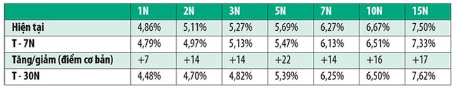 Theo số liệu Bloomberg, lợi suất trái phiếu tuần qua đã tăng rõ rệt tại tất cả các kỳ hạn (xem bảng). Đúng như dự báo của chúng tôi, các yếu tố như tăng trưởng tín dụng mạnh mẽ, giá đồng USD tiếp tục leo thang và kỳ vọng lạm phát tăng trở lại đã khiến lợi suất trái phiếu tăng rõ rệt và tạo lập xu hướng mới.