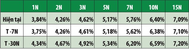 Theo số liệu từ Bloomberg, lợi suất phân hoá theo các kỳ hạn còn lại khác nhau, tuy nhiên, mức độ tăng/giảm không đáng kể. Duy chỉ có trái phiếu kỳ hạn 7 năm tăng 14 điểm cơ bản, lên mức 5,76%/năm. Trái phiếu 1, 2, 3, 5, 10 và 15 năm ghi nhận lần lượt tại 3,84%/năm (+9 điểm cơ bản), 4,26%/năm (không thay đổi), 4,62% (+1 điểm cơ bản), 5,17% (-1 điểm cơ bản), 6,40%/năm (+ 2 điểm cơ bản) và 7,09%/năm (- 1 điểm cơ bản).