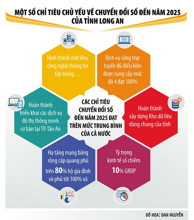 Trong giai đoạn 2023 - 2025, Tỉnh ủy Long An đề ra 6 nhiệm vụ và giải pháp tập trung thực hiện chuyển đổi số. Trong đó, tiếp tục tăng cường công tác lãnh đạo, chỉ đạo quán triệt và triển khai thực hiện hiệu quả Nghị quyết số 21-NQ/TU của Ban Thường vụ Tỉnh ủy gắn với Đề án 06 của Chính phủ và các chủ trương, chính sách về chuyển đổi số; xem đây là một trong những đột phá quan trọng góp phần cụ thể hóa chủ trương của Đảng về phát triển hạ tầng thông tin, viễn thông, tạo nền tảng chuyển đổi số quốc gia, từng bước phát triển chính quyền số, kinh tế số và xã hội số.