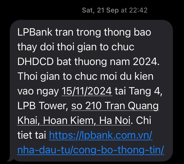 ĐHĐCĐ bất thường của Ngân hàng TMCP Lộc Phát Việt Nam (LPBank; mã chứng khoán: LPB) ban đầu dự kiến tổ chức vào ngày 22/9/2024 với những tin đồn về thay đổi nhân sự cấp cao, nhưng đến đêm khuya ngày 21/9/2024, các cổ đông bất ngờ nhận được tin nhắn thay đổi thời gian tổ chức và dự kiến thời gian là ngày 15/11/2024.
