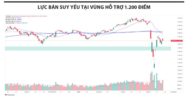 Sau tuần hồi phục mạnh từ vùng đáy 1.070 điểm, VN-Index bước vào tuần giao dịch vừa qua với diễn biến giằng co rõ nét khi nhiều vị thế ngắn hạn bắt đầu có lãi và áp lực chốt lời xuất hiện. Chỉ số tạm chững quanh mốc 1.250 điểm và điều chỉnh để kiểm định áp lực cung - cầu. Tuy nhiên, tại vùng hỗ trợ 1.200 điểm, lực bán suy yếu rõ rệt, tạo điều kiện cho thị trường phục hồi trong 2 phiên cuối tuần, VN-Index đóng cửa tại 1.220 điểm, giảm nhẹ so với cuối tuần trước đó.