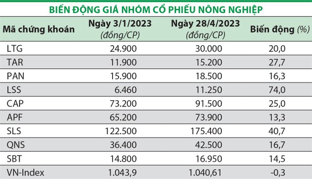 Hưởng lợi từ đà tăng của giá mía đường thế giới do lo ngại nguồn cung thiếu hụt, cổ phiếu của các công ty mía đường như LSS, SLS, QNS, SBT cũng tăng giá mạnh. Trong đó, mã SLS của Công ty cổ phần Mía đường Sơn La đạt 172.400 đồng/cổ phiếu vào ngày 28/4/2023, tăng hơn 40% so với đầu năm. Quý I/2023, Mía đường Sơn La ghi nhận 109 tỷ đồng lợi nhuận, gần gấp đôi cùng kỳ và là mức lợi nhuận theo quý cao nhất của Công ty.