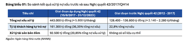 Theo Báo cáo, thực tế Nghị quyết 42 đã mang lại cho hệ thống Ngân hàng những kết quả nhất định, góp phần tạo điều kiện nâng cao tốc độ và khả năng xử lý nợ xấu, đồng thời mở ra cơ chế pháp lý trọng yếu cho việc xử lý tài sản bảo đảm. Kết quả xử lý nợ xấu trong giai đoạn 2017-2023 cho thấy tốc độ, tỷ lệ khách hàng tự trả nợ cũng như khả năng xử lý tài sản bảo đảm đều cải thiện rõ rệt so với giai đoạn trước.