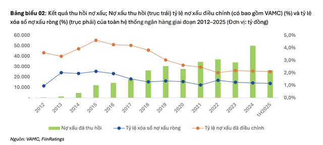 Bên cạnh đó, Nghị quyết 42 cũng hỗ trợ cải thiện đáng kể hiệu quả thu hồi và kiểm soát rủi ro tín dụng của hệ thống ngân hàng. Trong giai đoạn 2012-2016, tỷ lệ Nợ xấu điều chỉnh (bao gồm nợ nhóm 3-5 và VAMC) được duy trì ở mức cao đạt khoảng 3-5%, với giá trị thu hồi còn hạn chế (dưới 15.000 tỷ đồng/năm) và tỷ lệ xóa sổ nợ xấu ròng (net write-offs) thường xuyên trên 2%. Từ sau năm 2017, hệ thống ghi nhận sự cải thiện rõ rệt khi tỷ lệ Nợ xấu điều chỉnh giảm về mức 2,0-2,5%, với giá trị thu hồi tăng gấp đôi chỉ trong 5 năm; tăng từ 17,9 nghìn tỷ đồng (2017) lên 36.900 tỷ đồng (2022), đồng thời tỷ lệ xóa sổ nợ xấu ròng duy trì quanh mức 1,0-1,5%.