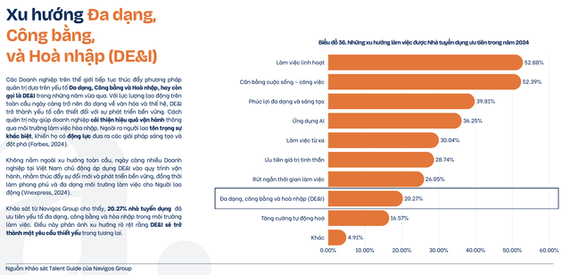 Báo cáo ghi nhận sự gia tăng mạnh mẽ của xu hướng Đa dạng, Công bằng và Hòa nhập (DE&I) trong doanh nghiệp. Cụ thể, 20,27% nhà tuyển dụng đã ưu tiên phát triển yếu tố này nhằm tạo ra môi trường làm việc đa dạng, đảm bảo cơ hội công bằng cho mọi nhân viên. Xu hướng này không chỉ góp phần nâng cao tinh thần làm việc mà còn đóng vai trò quan trọng trong việc giữ chân nhân tài.