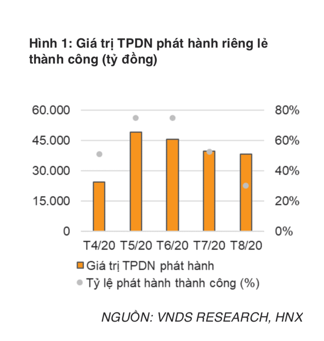 Lãi suất trái phiếu doanh nghiệp bình quân của các đợt phát hành riêng lẻ trong tháng 8 năm 2020 đang ở mức 9,5%/năm; cao hơn 144 điểm cơ bản so với tháng 7.