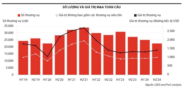 Cụ thể, trong năm 2024, tổng giá trị các thương vụ M&A trên toàn cầu tăng 5%, chủ yếu do giá trị trung bình của mỗi thương vụ tăng lên, mặc dù khối lượng giao dịch giảm 17% do những bất ổn kinh tế vĩ mô xoay quanh lạm phát và lãi suất, làm kìm hãm hoạt động M&A đối với các thương vụ vừa và nhỏ. Ngược lại, thị trường M&A chứng kiến sự gia tăng đáng kể ở phân khúc cao cấp hơn, với hơn 500 thương vụ trị giá hơn 1 tỷ USD, tăng từ 430 thương vụ trong năm 2023. Ngoài ra, các thương vụ siêu lớn (megadeal) tăng 18%, với 72 thương vụ, tổng trị giá hơn 5 tỷ USD, so với 61 thương vụ của năm 2023.