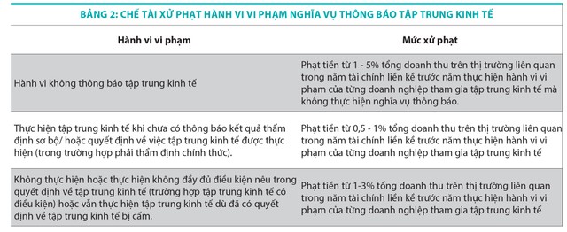 Theo quy định pháp luật hiện hành, các doanh nghiệp có hành vi vi phạm nghĩa vụ thông báo tập trung kinh tế có thể bị phạt tiền, áp dụng các hình thức xử phạt bổ sung và/hoặc bị buộc áp dụng các biện pháp khắc phục hậu quả (xem bảng 2).
