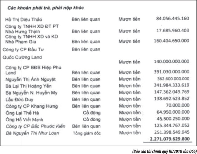 Tính đến cuối quý III/2018, QCG có 2.271,079 tỷ đồng nợ phải trả từ hình thức mượn tiền các bên có liên quan. Trong số này, Công ty cổ phần Bất động sản Hiệp Phú Land là đơn vị cho QCG mượn tiền nhiều nhất: 391,03 tỷ đồng. Cá nhân bà Lại Thị Hoàng Yến, con gái ông Lại Thế Hà, Phó tổng giám đốc QCG cho Công ty mượn gần 342 tỷ đồng. Bản thân ông Hà cũng có số dư 64,95 tỷ đồng tiền cho Công ty mượn.