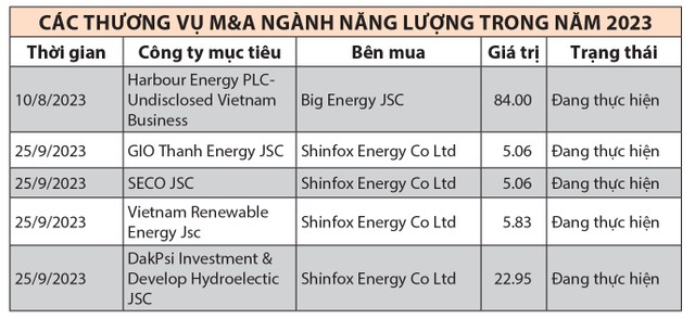 Đối với ngành năng lượng, theo thống kê của Công ty Chứng khoán DSC, tổng giá trị các thương vụ đạt 758 triệu USD trong năm 2022. Năm 2023, M&A ngành năng lượng tương đối trầm lắng, một phần do kinh tế thế giới ảm đạm, ảnh hưởng tới dòng vốn của nhà đầu tư nước ngoài vào Việt Nam; một phần do nhiều doanh nghiệp năng lượng trong nước sử dụng đòn bẩy tài chính cao gặp khó khăn khi thị trường trái phiếu bị “hãm phanh”. Tuy nhiên, về dài hạn, xu hướng chuyển đổi sang năng lượng tái tạo sẽ là động lực lớn cho hoạt động M&A trong ngành năng lượng.