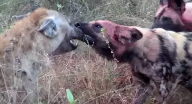 Ở đoạn clip, có thể thấy rõ khung cảnh một con linh cẩu đơn độc đang cố gắng tấn công đàn chó hoang để có thể chiếm lấy phần thưởng là xác của một con mồi vừa mới bị săn. Đương nhiên, đàn chó hoang không dễ gì mà nhường lại miếng thịt béo bở cho một kẻ xâm phạm có trong mình dã tâm lớn như thế.