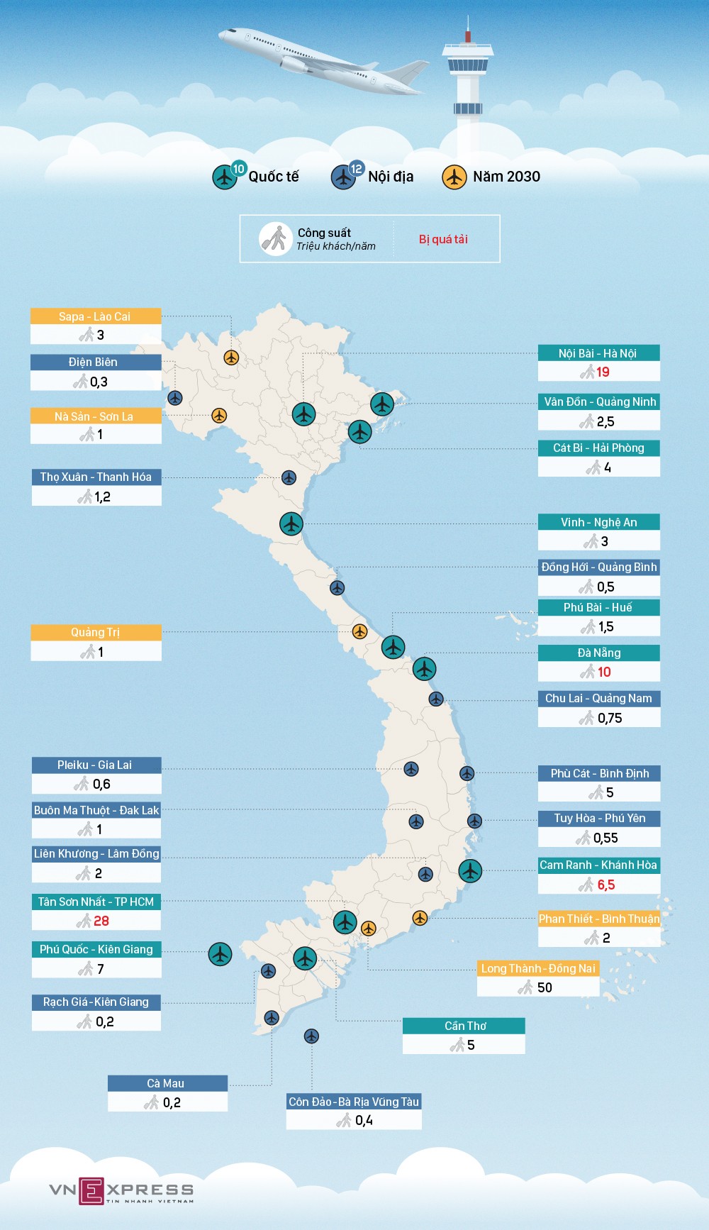 Việt Nam hiện có 22 sân bay, trong đó có 10 cảng hàng không quốc tế và 12 nội địa.