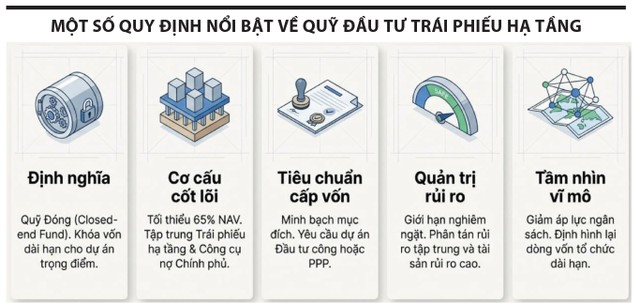 Quỹ trái phiếu hạ tầng được đầu tư vào trái phiếu doanh nghiệp phát hành để phát triển hạ tầng, gồm trái phiếu niêm yết, trái phiếu chào bán ra công chúng và trái phiếu doanh nghiệp phát hành riêng lẻ. Tuy nhiên, để được đầu tư, quỹ phải có quy định trong Điều lệ quỹ và bản cáo bạch; đồng thời phải có tài liệu chứng minh mục đích phát hành là để phát triển hạ tầng hoặc cơ cấu lại nợ đã vay trước đó để phát triển hạ tầng của chính tổ chức phát hành. Đáng chú ý hơn, dự án hạ tầng được viện dẫn phải là dự án đầu tư công hoặc dự án PPP theo quy định pháp luật liên quan. Đây là điểm rất quan trọng, vì nó hạn chế nguy cơ “gắn nhãn hạ tầng” một cách hình thức để huy động vốn.