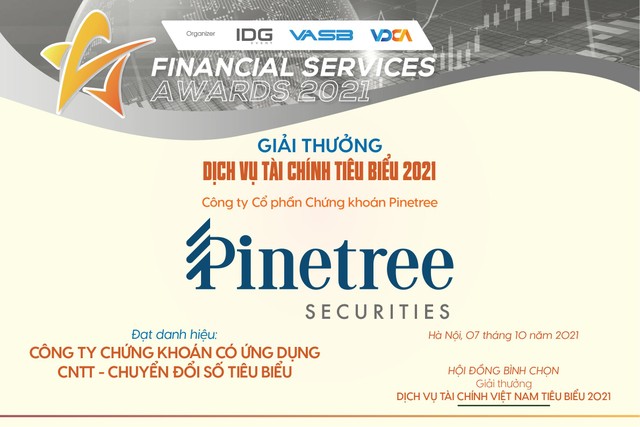 (ĐTCK) Ngày 7/10/2021 tại Hà Nội, Pinetree vinh dự là đơn vị duy nhất nhận giải thưởng “Công ty chứng khoán có Ứng dụng CNTT Chuyển đổi số tiêu biểu” trong khuôn khổ Diễn đàn Dịch vụ tài chính số được tổ chức bởi Tập đoàn Dữ liệu Quốc tế IDG phối hợp với Hiệp hội Kinh doanh Chứng khoán Việt Nam (VASB).