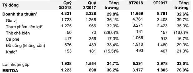 Riêng trong quý gần nhất, quý III/2018, Masan Consumer đạt doanh thu thuần 4.321 tỷ đồng, tăng 29,8% so với cùng kỳ năm 2017 và dự báo tăng trưởng 30% và lợi nhuận gấp 3 lần trong năm 2018 so với năm 2017.
