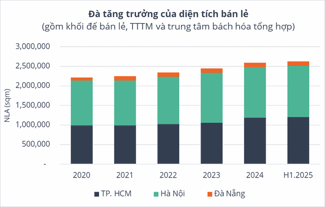 Số liệu bất động sản càng củng cố xu hướng này. Từ năm 2020 đến nửa đầu năm 2025, tổng diện tích cho thuê thực (NLA) của khối đế bán lẻ, TTTM và trung tâm bách hóa tổng hợp tại Hà Nội, Đà Nẵng và TP.HCM đã ghi nhận tốc độ tăng trưởng kép hàng năm (CAGR) đạt 3,13%, tương đương 2,6 triệu m2 tính đến hết quý II/2025. Trong các mô hình MT, cửa hàng tiện lợi là loại hình tăng trưởng nhanh nhất nhờ nhu cầu về tính thuận tiện và dễ tiếp cận.