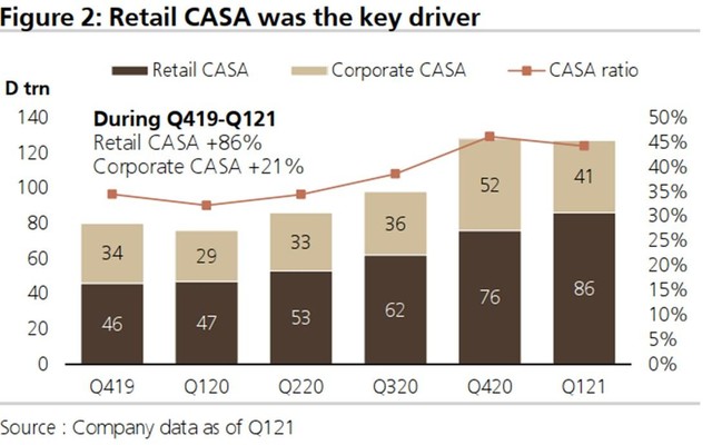 Tỷ lệ CASA của Techcombank đã tăng từ 34,5% năm 2019 lên 44,2% trong Q1/2021, chủ yếu nhờ vào phân khúc khách hàng cá nhân. Điều này giúp chi phí huy động vốn giảm còn 2,24%, thấp nhất trong ngành (mức trung bình của ngành là 3,6% trong Q1/2021).