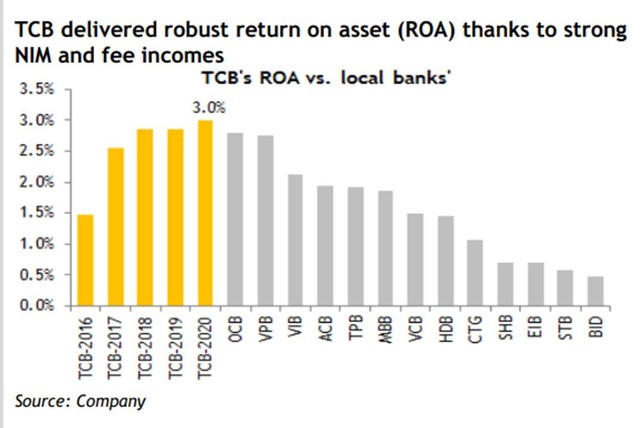 “TCB xứng đáng được định giá vượt trội dựa trên ROA cao (hơn 3% giai đoạn 2021-2023), nguồn vốn mạnh cho phép duy trì tăng trưởng giá trị sổ sách ở mức 20%/năm trong 3 năm tới”, các chuyên gia phân tích của UBS đánh giá.