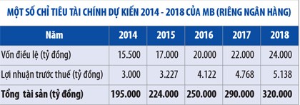 Từ những mục tiêu chiến lược đó, chúng tôi đã cụ thể hóa thành các chỉ tiêu kinh doanh hàng năm, sẽ thông qua ĐHCĐ sắp tới. Chúng tôi phấn đấu đến năm 2018 đưa tổng tài sản của riêng Ngân hàng đạt mức 320.000 tỷ đồng, vốn điều lệ đạt 24.000 tỷ đồng; lợi nhuận đạt tối thiểu 5.000 tỷ đồng và tỷ lệ nợ xấu hàng năm duy trì ở mức < 3%.